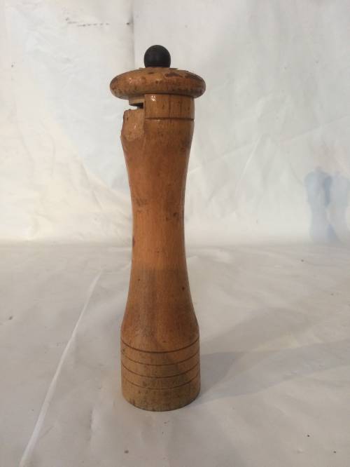 Ce grand moulin à poivre est un objet assez simple et sans décoration, la structure de l'objet est réalisée en bois. Il est de forme cylindrique mais plus creusé au centre et plus évasé aux extrémités. Au bas de l'objet, quatre cercles sont légèrement gravés dans le bois.