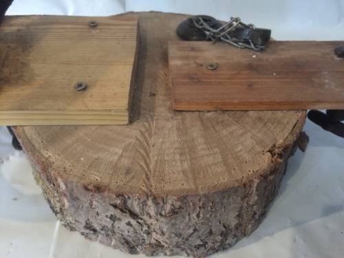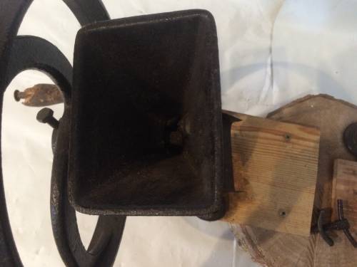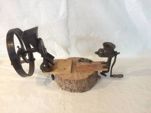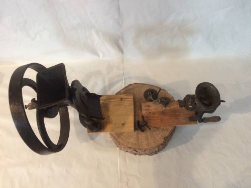 Mis à part les mécanismes réalisés en fer, la fabrication a l'air d'être artisanale : deux planches de bois clouées à un simple rondin. Ce petit moulin devait servir à un usage purement personnel au vu de sa petite taille et de sa fabrication.