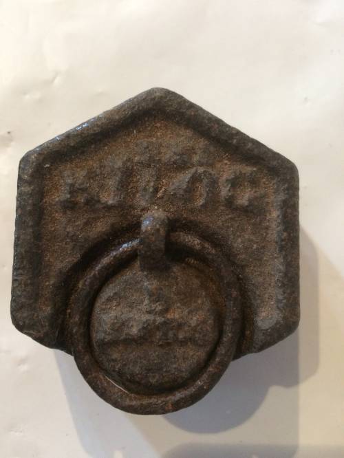 Ce dernier, sert de petite poignée à cet objet, ce qui permet de le soulever et le déposer facilement. Celle-ci est particulièrement utile pour les plus gros poids. Autour de l'anneau il y a une autre inscription.
