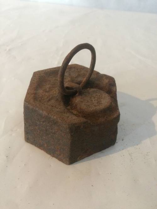Ce poids est réalisé en fonte, ce type d'objet était utilisé sur des anciennes balances. Les balances avaient alors deux plateaux, les poids y étaient déposés pour de nombreuses transactions ou pesées. En effet, ils servaient d'instrument de mesure grâce au poids inscrit sur l'objet : les mesures et pesées étaient faciles à entreprendre pour les commerçants.