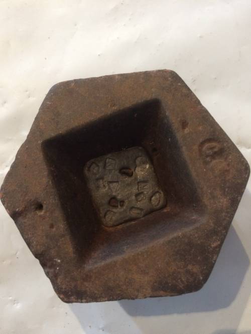 Le dessous de ce poids est aussi creusé (avec la forme d'un carré), dans le fond sont poinçonnées plusieurs lettres servant de repères et/ou de marques.