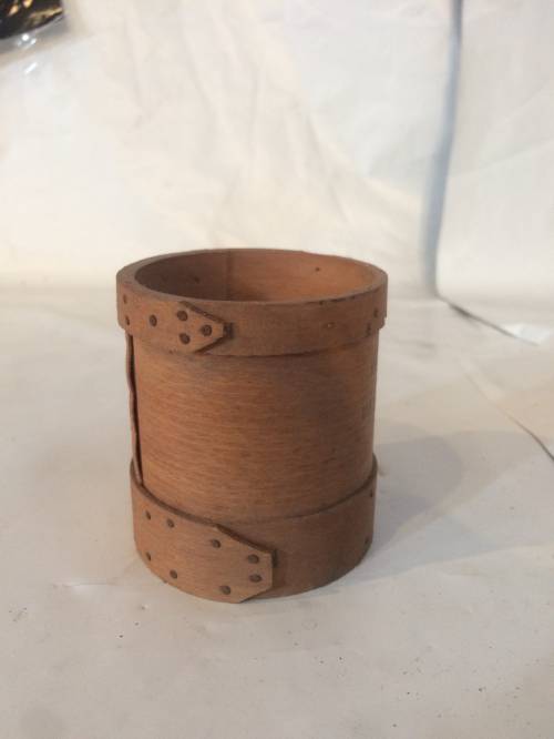 Cet objet est "renforcé" par deux rebords placés en haut et en bas de celui-ci. Le rebord du haut est un fin morceau de bois qui entoure le récipient et qui est fixé par des clous. Celui du bas, est plus large et disposé et fixé comme le premier (les clous sont bien visibles).