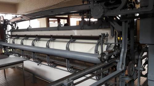 Le chariot qui supporte cette rangée d'aiguilles est approché du tissu grâce à une manivelle actionnée par le brodeur. Les aiguilles traversent le tissu et, lâchées par les pinces du premier chariot, sont reprises par les pinces de l'autre chariot qui a été approché et qui va ensuite reculer …