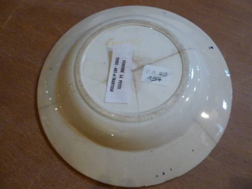 Palette camaieu de bleu. Bordure de feuilles en épis soulignée d'un léger filet de petits points entouré de deux filets, l'un clair l'autre plus foncé. Inspiré des décors de Tournai.