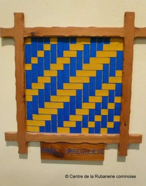 Dessin d’une armure “Bride irrégulière” composé de rubans disposés verticalement représentant la chaîne et de rubans horizontaux pour la trame.