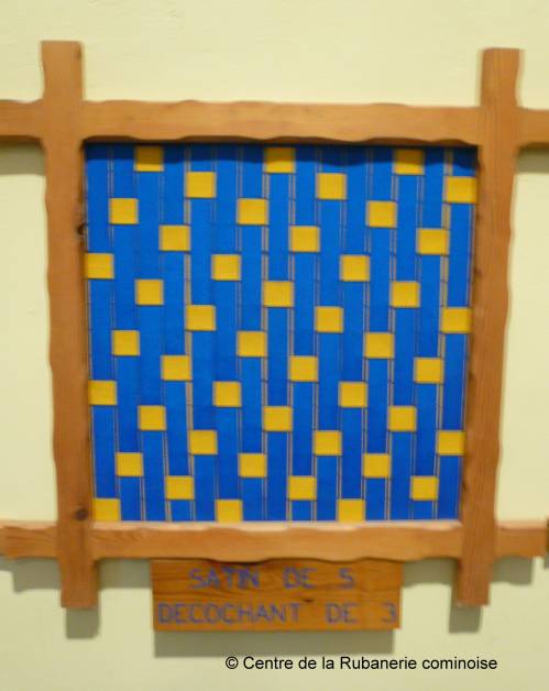 Dessin d’une armure “Satin de 5 décochant de 3” composée de rubans disposés verticalement représentant la chaîne et de rubans horizontaux pour la trame.
