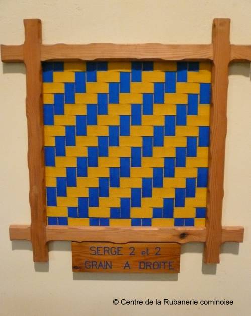 Dessin d’une armure “Sergé 2 et 2 grain à droite” composée de rubans disposés verticalement représentant la chaîne et de rubans horizontaux pour la trame.