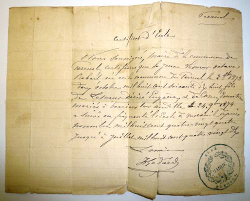 Certificat d’école écrit entièrement à la main par le maire de Perruel (Eure) en faveur du jeune Octave-Robert Lesueur.