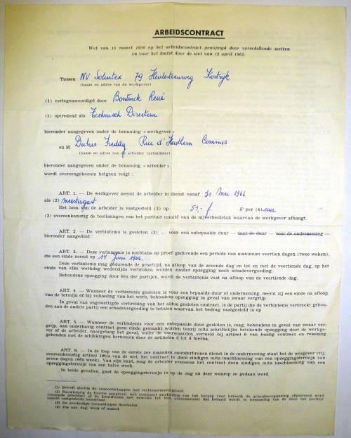 Le document stipule, entre autres, la rémunération horaire (51 fracs belges) ainsi que 13 articles régissant le contrat.