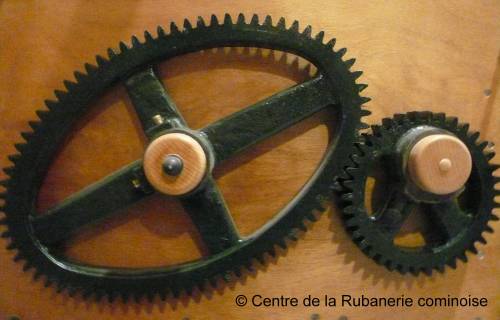 Le système est appliqué sur un métier du musée de la rubanerie à Comines sous forme de deux couples de pignons, travaillant à l’opposé l’un de l’autre.