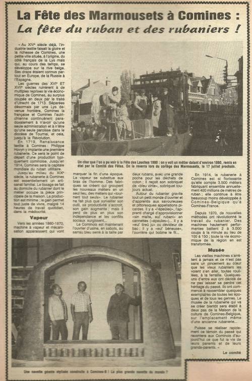 Coupure de presse, contrecollée sur une feuille de carton jaune perforée. Rédigé par le Comité des Fêtes de Comines, l’article explique le pourquoi de la Fête des Marmousets en opérant un bref historique du textile à Comines.