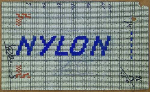 Mise en carte pour ruban jacquard réalisée au crayon rouge, bleu et ordinaire, comportant, sur deux lignes, les inscriptions : “NYLON; 40”.