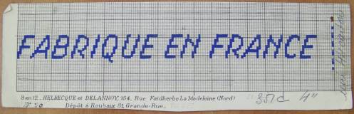 Mise en carte pour ruban jacquard réalisée au crayon bleu et comportant la mention : “FABRIQUÉ EN FRANCE”.
