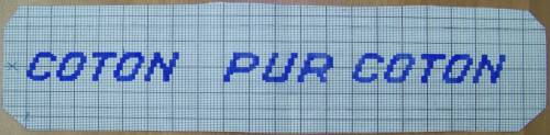 Mise en carte pour ruban jacquard réalisée au crayon bleu et portant l’inscription : “COTON PUR COTON”.