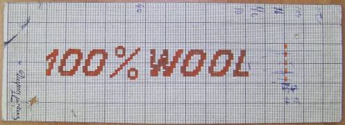 Mise en carte réalisée au crayon rouge, portant l’inscription : “100% WOOL”.