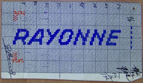 Mise en carte pour ruban jacquard réalisée au crayon bleu et portant la mention : “RAYONNE”.