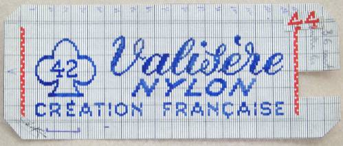 Mise en carte pour ruban jacquard portant deux bords rouges et le chiffre rouge “44” au côté droit, un logo bleu représentant un trèfle dans lequel est inscrit le numéro “42” et des inscriptions : “Valiesère; Nylon; Création française”.