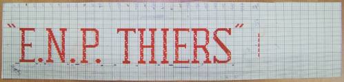 Mise en carte pour ruban jacquard réalisée au crayon rouge et comportant les mentions placées entre guillemets : “E.N.P. THIERS”.