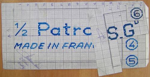 Mise en carte pour ruban jacquard en 3 parties, réalisée au crayon bleu, comportant, sur le feuillet principal, les mentions : “1/2 PATRON; MADE IN FRANCE”.
