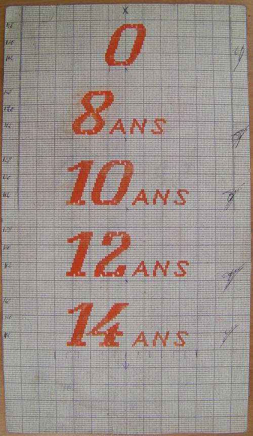 Mise en carte pour ruban jacquard réalisée au crayon rouge, comportant, sur 5 lignes, les inscriptions : “0; 8 ANS; 10 ANS; 12 ANS; 14 ANS”.