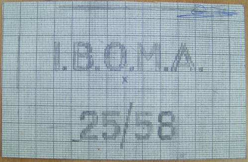 Mise en carte pour ruban jacquard réalisée au crayon ordinaire et comportant, sur deux lignes, les inscriptions : “I.B.O.M.A.; 25/58”.