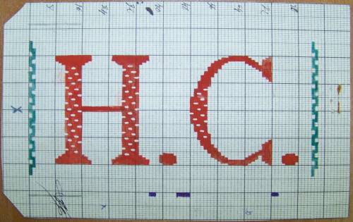 Mise en carte pour ruban jacquard réalisée au crayon rouge et vert, portant les mentions : “H.C.”.