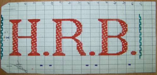 Mise en carte pour ruban jacquard réalisée à la gouache rouge et verte, portant les mentions : “H.R.B.”.