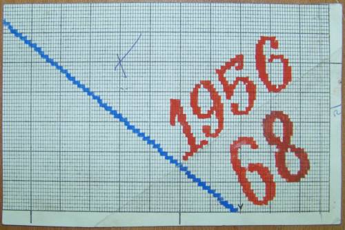 Mise en carte pour ruban jacquard réalisée à la gouache rouge et bleue, portant, à côté d’une diagonale descendante, les inscriptions : “1956; 68”.