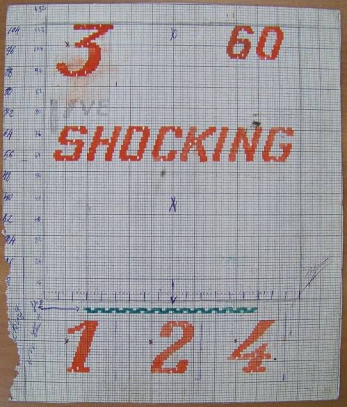 Mise en carte pour ruban jacquard réalisée à la gouache rouge et verte et portant les mentions : “3 60; SHOCKING; 1 2 4”.