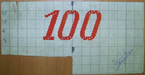 Mise en carte pour ruban jacquard réalisée à la gouache rouge et comportant l’inscription : “100”.