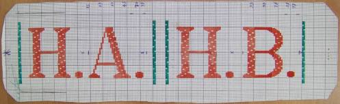 Mise en carte pour ruban jacquard réalisée à la gouache rouge et verte, portant les inscriptions : “H.A.; H.B.”.