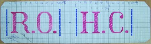 Mise en carte pour ruban jacquard réalisée à la gouache rose et bleue, comportant les mentions entrecoupées de bandes verticales : “R.O.; H.C.”.