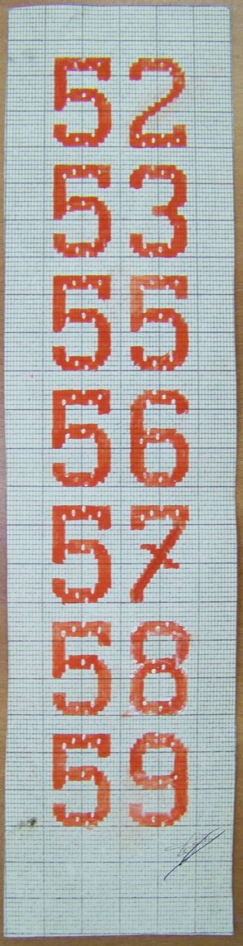 Mise en carte pour ruban jacquard réalisée à la gouache rouge, portant les mentions : “52; 53; 55; 56; 57; 58; 59”. Au verso, des restes d’inscriptions au crayon ordinaire témoignent que la pièce a été découpée et que sa majeure partie manque.