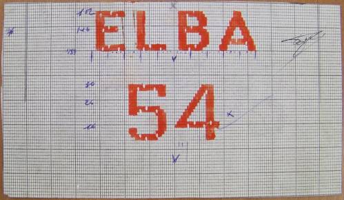 Mise en carte pour ruban jacquard réalisée à l’encre rouge, portant les inscriptions : “ELBA; 54”.
