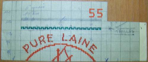 Mise en carte pour ruban jacquard réalisée au crayon rouge, noir et ordinaire, portant des inscriptions surplombant un tiers de logo “Petit Bateau” (voir MRc246 à MRc249) et précisant : “55; PURE LAINE”.