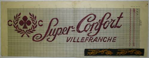 Dessin de mise en carte pour ruban jacquard comportant, en rouge foncé sur fond blanc, un logo composé d’un trèfle entre deux lauriers précédés de la lettre “C”, accosté des inscriptions sur deux lignes : “Super-Confort; VILLEFRANCHE”.