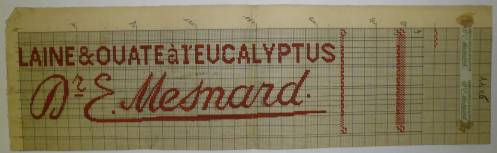 Dessin de mise en carte pour ruban jacquard comportant, en rouge foncé sur fond blanc, les inscriptions sur deux lignes : “LAINE & OUATE à L’EUCALYPTUS; Dr E. Mesnard”.
