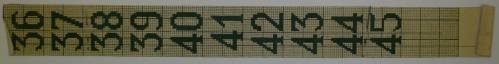 Dessin de mise en carte pour ruban jacquard comportant, en vert sur fond blanc, les inscriptions sur dix lignes : “36; 37; 38; 39; 40; 41; 42; 43; 44; 45”.