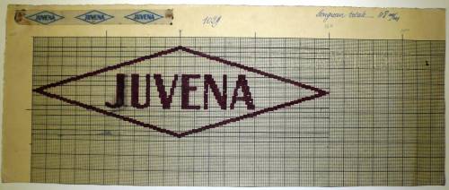 Dessin de mise en carte pour ruban jacquard comportant, en rose foncé et bleu sur fond blanc, l’inscription insérée dans un losange : “JUVENA”.