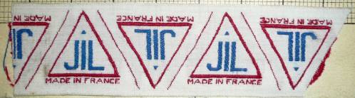 Dessin de mise en carte pour ruban jacquard comportant, en rouge, vert et noir sur fond blanc, l’inscription soulignant un triangle frappé de la mention “JIL” : “MADE IN FRANCE”.
