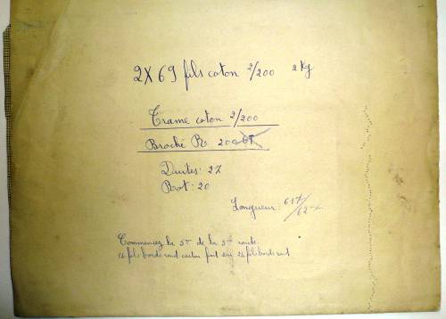 Au verso, des indications manuscrites déterminent le nombre de fils requis, leur titrage, le nombre de duites et le rot qui doit servir à battre la duite, ainsi qu’une mention précisant : “Commencez la 5me de la 3me route; 16 fils bords rond carton fait sur 24 fils bords rond”.
