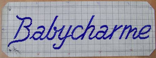 Mise en carte pour ruban jacquard réalisée au crayon bleu et portant l’inscription : “Babycharme”.