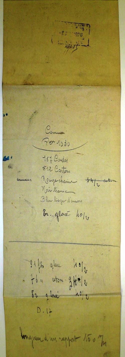 Au verso, des indications manuscrites déterminent le nombre de cordes et de cartons participant à la réalisation de la pièce, ainsi qu’un cachet estampillé “CARTONS JACQUARD; PIERRE VIAL FILS; 8 J.. 1926; ROUBAIX”.
