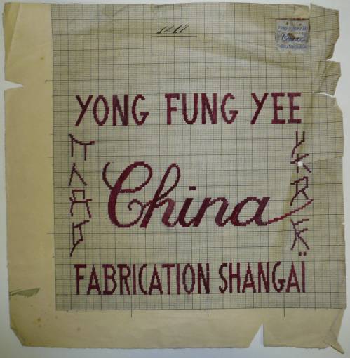 Dessin de mise en carte pour ruban jacquard comportant, en rouge et noir sur fond blanc, l’inscription sur trois lignes, entourée d’idéogrammes chinois : “YONG FUNG YEE; China; FABRICATION SHANGAÏ”.
