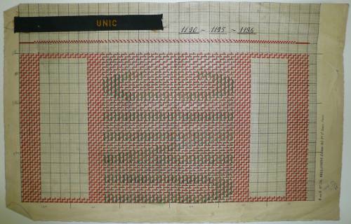 Dessin de mise en carte pour ruban jacquard comportant, en rouge, vert et noir sur fond blanc, l’inscription : “UNIC”.