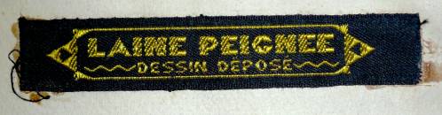 Dessin de mise en carte pour ruban jacquard comportant, en rose foncé et noir sur fond blanc, l’inscription sur deux lignes au sein d’un cartouche rectangulaire aux extrémités triangulaires : “LAINE PEIGNEE; DESSIN DEPOSE”.
