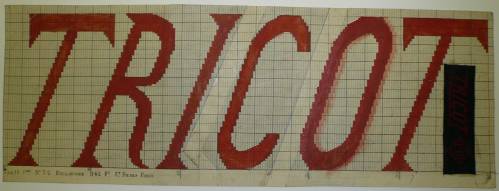 Dessin de mise en carte pour ruban jacquard comportant, en rouge et noir sur fond blanc, l’inscription : “TRICOT”.