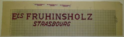 Dessin de mise en carte pour ruban jacquard comportant, en rose foncé et noir sur fond blanc, l’inscription sur deux lignes : “Ets. FRUHINSHOLZ; STRASBOURG”.