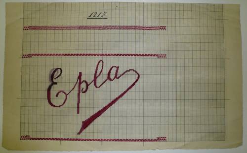 Dessin de mise en carte pour ruban jacquard comportant, en rouge et noir sur fond blanc, l’inscription : “Epla”.