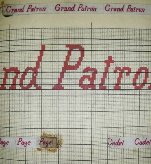 Dessin de mise en carte pour ruban jacquard comportant, en rouge, bleu et noir sur fond blanc, l’inscription sur quatre lignes : “1/2 Patron Grand Patron; Homme Page Cadet; Petite Femme Grande Femme; MADE IN FRANCE”.